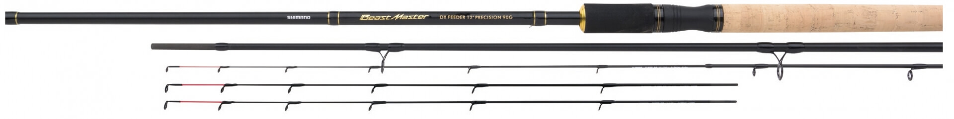 Rad prútov Shimano Beastmaster DX Feeder špičkových parametrov bol pripravený za účelom splnenia náročných požiadaviek všetkých feedrových spôsobov rybolovu. Kvalita prútov vychádza z blanku, vyrobeného z kompozitu HPC60 s prímesou Biofibre, a z nového konštrukčného programu, vďaka čomu majú všetky prúty v celom rade fantastickú zdolávaciu akciu. Všetky feedrové prúty Beastmaster DX sú vybavené mimoriadne odolnými nehrdzavejúcimi očkami Shimano Hardlite, ktoré umožňujú bezproblémové použitie splietaných šnúr. Beastmaster DX má štíhly, ľahký a mimoriadne citlivý blank, ktorý svojou výnimočnou akciou uspokojí aj najlepších matchových špecialistov. Každý z prútov je vybavený trojicou citlivých špičiek, vyvážených a ladiacich s akciou vybraného prúta. Vrhacia záťaž je 90 g.