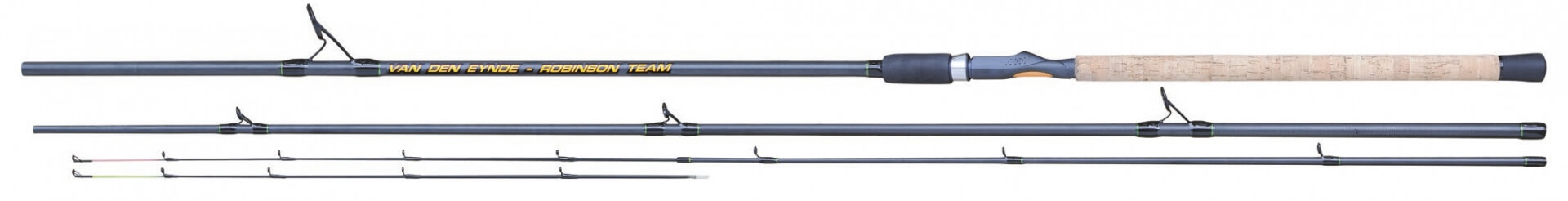 Prúty Van den Eynde - Robinson Team ponúkajú profesionálne náradie za prijateľné ceny. Nekompromisná kvalita a exkluzívny design sú výsledkom dlhoročnej práce pretekárov vo feedri z celej Európy. Séria Feeder MX je postavená na rýchlych multimodulových blankoch na báze grafitu s modulom pružnosti 62mln PSI . Očká sú zväčšené, ich tvar je prispôsobený potrebám ďalekého nahadzovania a znižovaniu rizika zamotania vlasca alebo šnúry. Rukoväť je korková. Balenie obsahuje 2 vymeniteľné špičky. Parametre prúta: dĺžka 3,60 m, záťaž 40-90 g, počet očiek 12, transport 128 cm, hmotnosť 206 g.