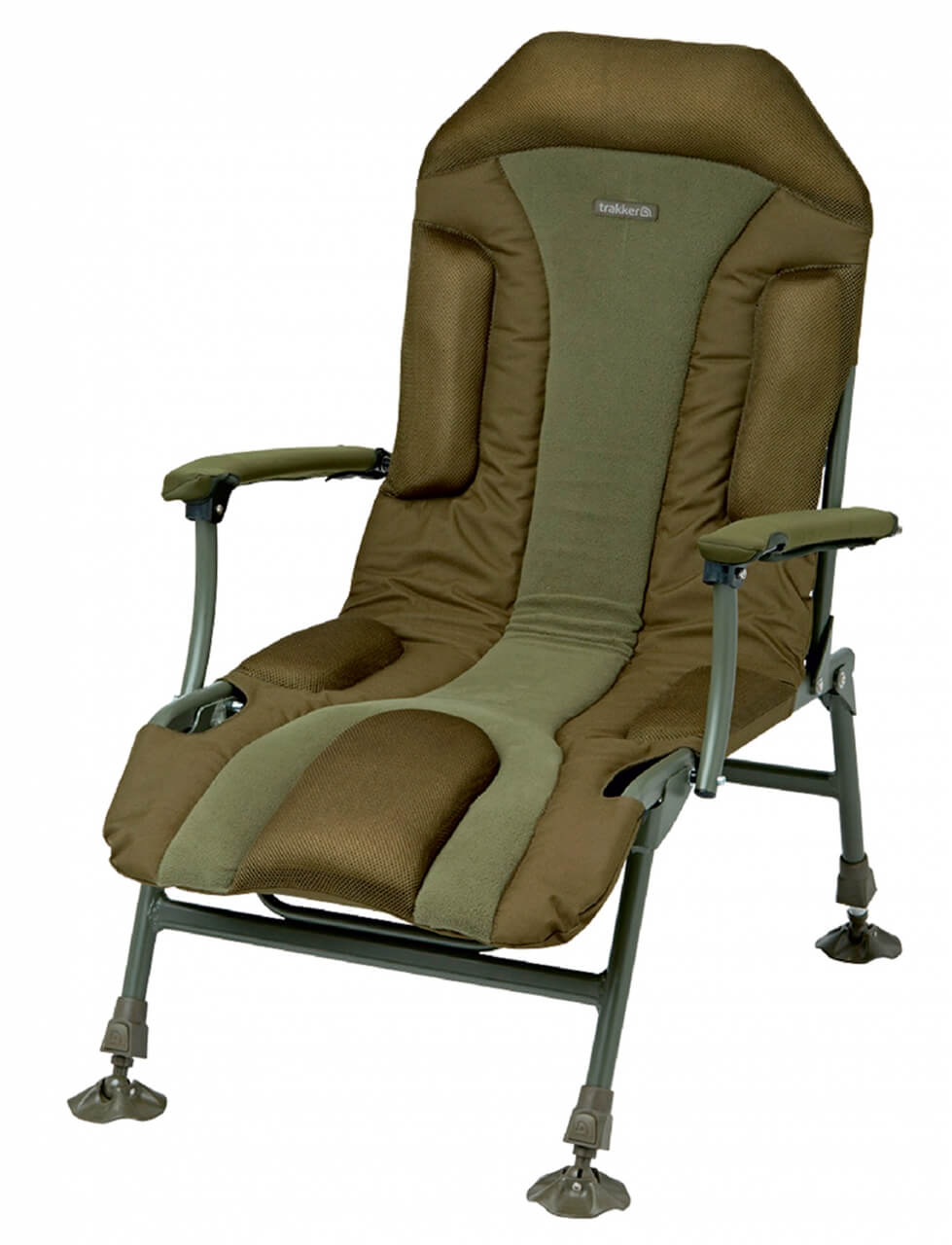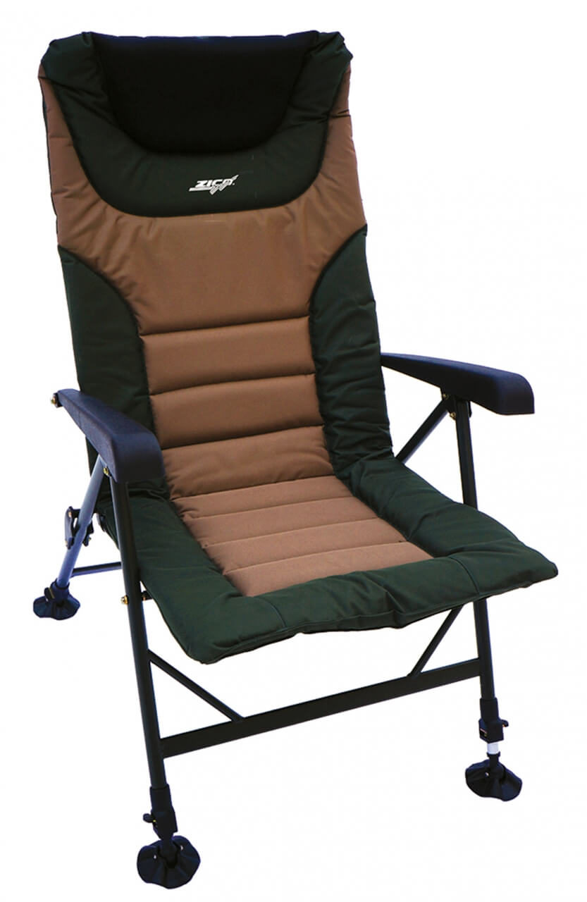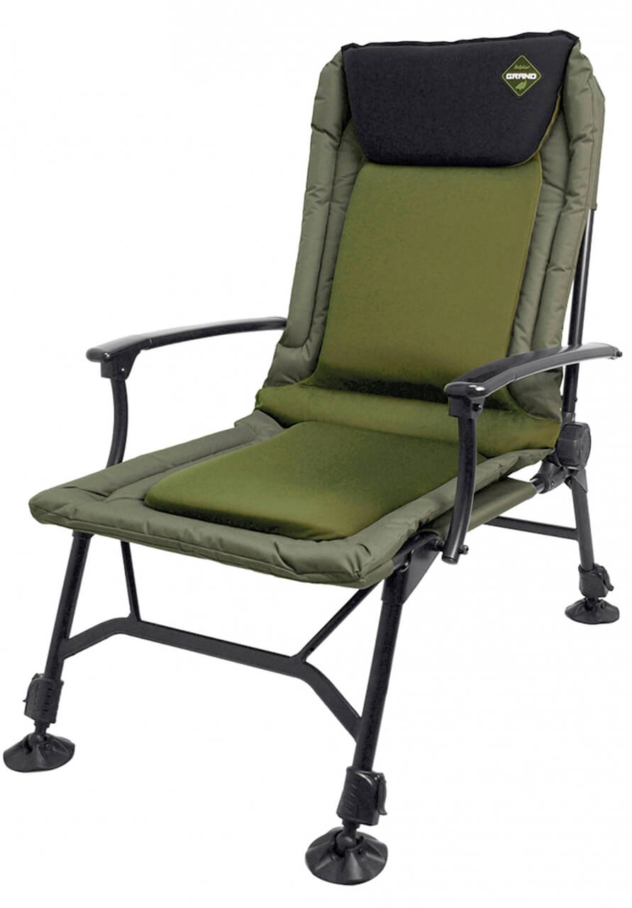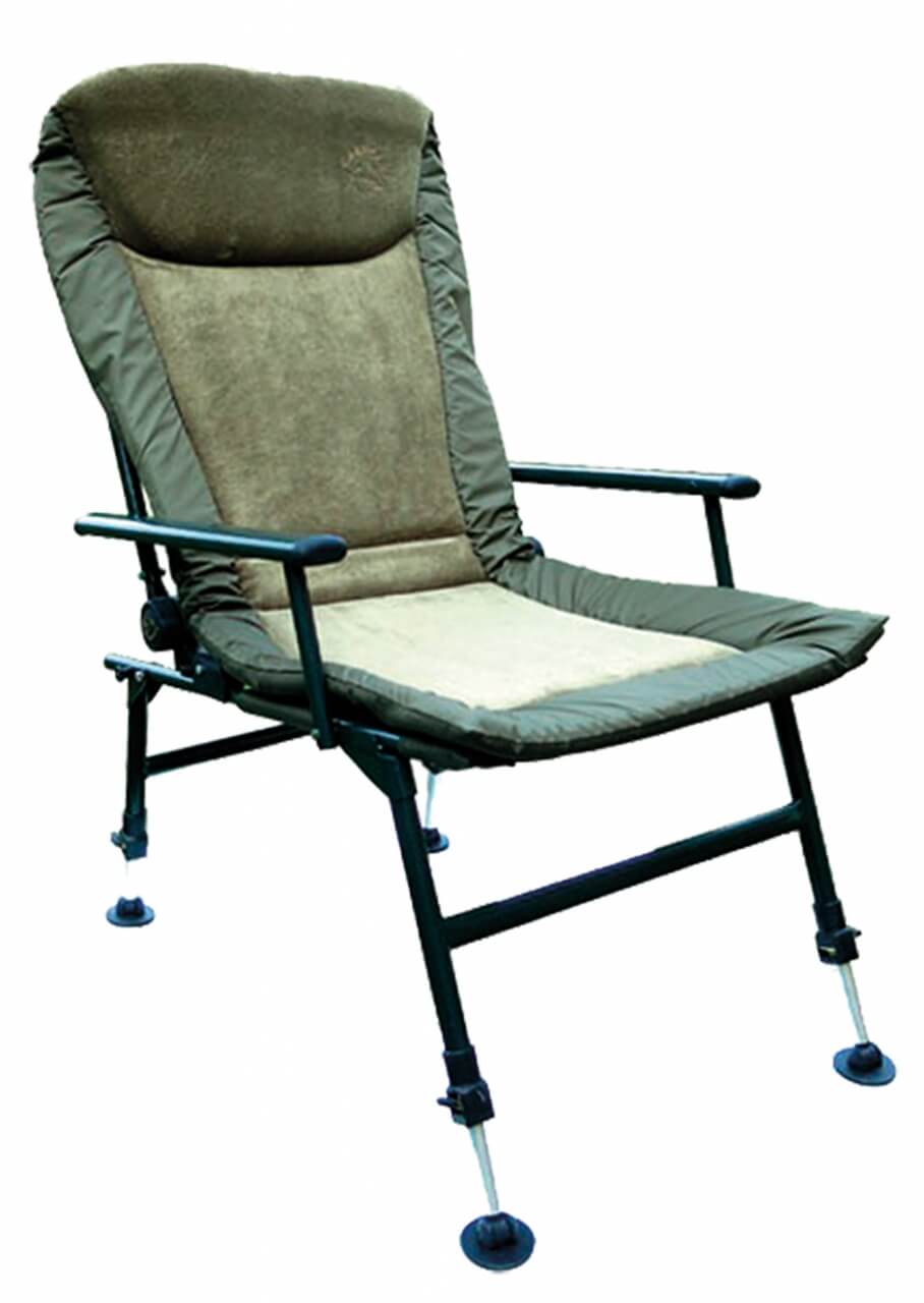 Kresielko s predĺženou opierkou chrbta, silným polstrovaním a potiahnutým fleecom pre maximálny komfort a pohodlie. Okraje sedadla sú vyrobené z odolnej, extra hrubej nylonovej tkaniny a polstrovanie má termo izolačné vlastnosti, ktoré vás ochráni pred chladom a vlhkom. Plne nastaviteľné zadné operadlo a lakťové opierky robia túto stoličku ideálnou pre dlhodobejší pobyt pri vode. Štyri výškovo nastaviteľné nohy s otočnými a veľkými pätkami zabraňujú zaboreniu do blata. Konštrukcia je z ľahkej, ale pevnej hliníkovej zliatiny so špeciálnou povrchovou úpravou v olivovej farbe. Použitý materiál polyester 600D je v spodnej časti potiahnutý nepriepustnou PVC vrstvou. V strednej časti sedadla je molitanová vrstva s hrúbkou 3 cm, ktorá je potiahnutá fleecom. Pod hlavou je komfortný vankúšik, ktorý umocní komfort a pohodlie. Rozmery sedadla: 51x64 cm. Výška operadla: 75 cm. Výška sedačky: 102 cm (+ 15 cm maximálne predĺženie nôh). Nosnosť do: 130 kg. Hmotnosť: 6,4 kg.