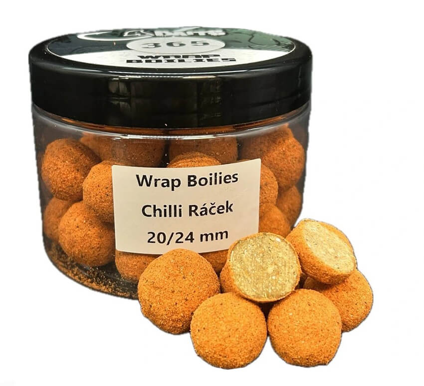 Wrap Boilies 365 Chilli Ráček sú extra atraktívne nástrahy s obaleným povrchom, ktoré kombinujú pikantné chilli a výraznú arómu rakov. Obalová vrstva z aktívneho mixu sa vo vode postupne rozpadáva a uvoľňuje silné pachové a chuťové signály, ktoré stimulujú kapry aj vo veľmi prechytávaných vodách.Boilies vo veľkostiach 20 mm a 24 mm sú ideálne pre selektívny lov väčších rýb a výborne držia aj pri dlhšom pobyte vo vode.