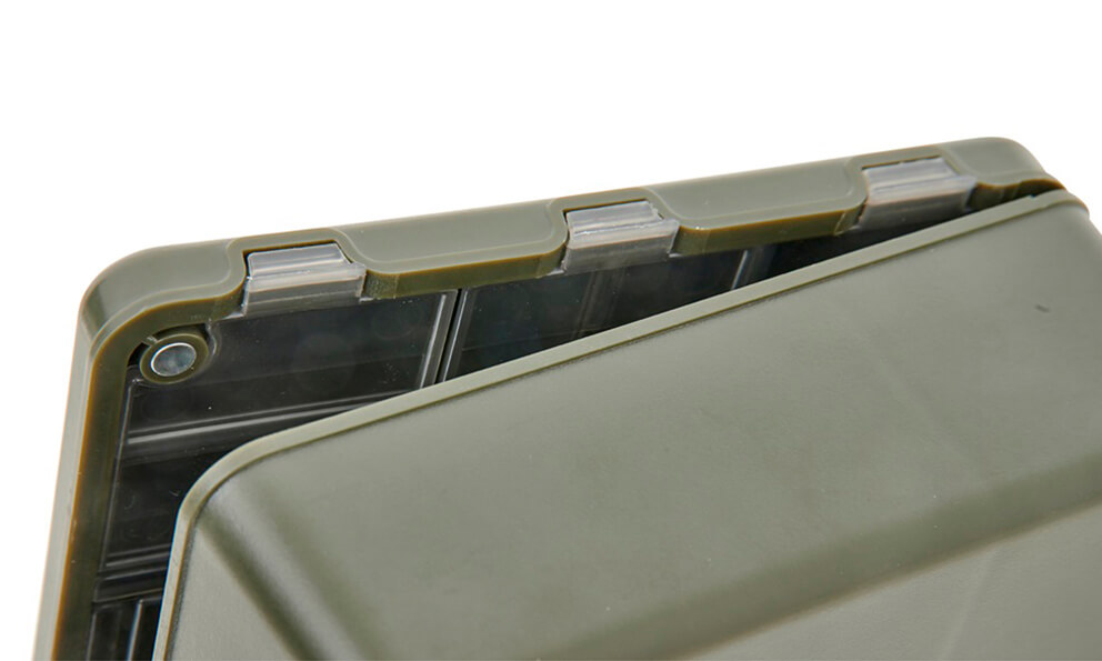 2. Sekcia s priehradkami: Spodná časť je vybavená systémom malých priehradiek s priehľadnými víčkami. Vďaka nim okamžite vidíte, kde máte háčiky, obratlíky, stopery či krúžky, bez toho aby ste museli každú priehradku otvárať.