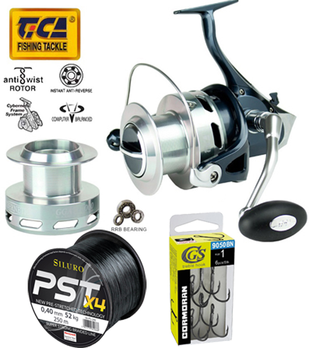 AKCIA: Navijak TICA Cybernetic GGAT 10000 + šnúra SILURO PST X4 + trojháčiky CORMORAN CGS Treble 9050BNNasledovník legendárneho modelu Tica GG 100, masívny veľký navijak, kovové telo, 2 kovové cievky, kapacita 440m/0,45mm, 9 ložísk, spoľahlivá vrchná brzda, ideálny na veľké sumce.