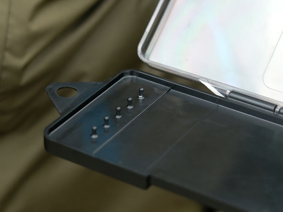 - Šetrnosť k materiálu: Vnútorná časť obsahuje mäkkú EVA penu, do ktorej bezpečne zapichnete háčiky bez rizika otupenia ich hrotov, zatiaľ čo plastové výbežky udržia slučky nadväzcov presne na svojom mieste.