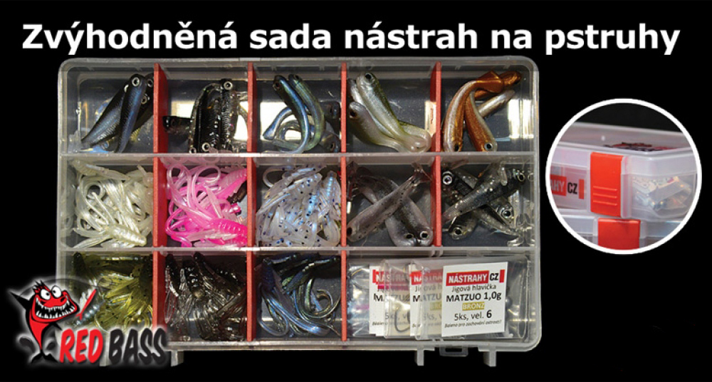 Starostlivo vybraná sada osvedčených nástrah pre lov pstruhov potočných, dúhových a sivoňov a k nim odpovedajúce jigové hlavičky. Balené v plastovej krabičke. Rozmer krabičky 17x10x3,5cm.Obsahuje: