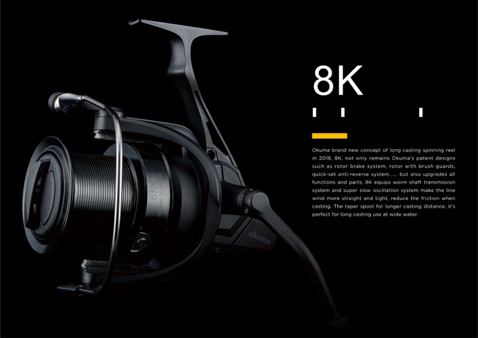 Tento rotačný naviják je osadený 6 ložiskami. Rotor so štetinovým prevodom zabraňuje motaniu a krúteniu vlasca medzi rotorom a hlavným hriadeľom. 8K je vybavený prevodovkou zo šnekovým hriadeľom a systémom veľmi pomalého kmitania aby vlasec pri nahadzovaní vyletoval z cievky rovnejšie a tesnejšie, čím sa znižuje trenie pri odvíjaní vlasca. Kužeľová cievka je ideálna pre extrémne ďaleké hody, čomu sa potešia najmä lovci na veľkých vodných plochách so zákazom vyvážania. 8K má rýchly anti-reverzný systém. Výkonná brzda s max. záťažou 18 kg. Prevod je priam excelentný a to 4,7:1. Telo navijaku je z antikorózneho materiálu, pevná zinková noha a drevená rukoväť dodáva navijaku eleganciu a dizajn.